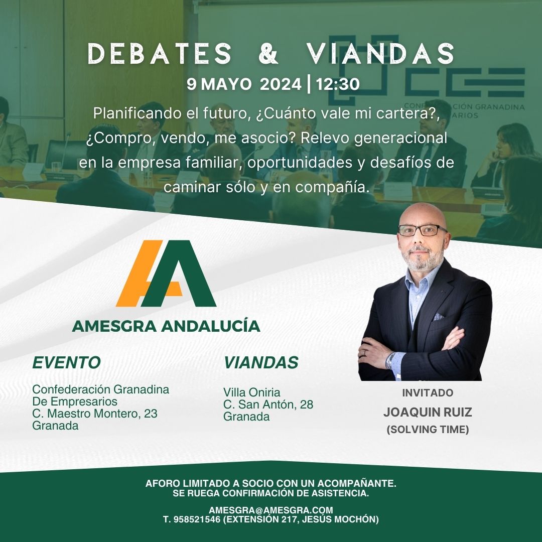 debates y viandasNo te pierdas nuestro próximo evento «Debates y Viandas» el 9 de mayo en la Confederación Granadina de Empresarios. Joaquín Ruiz López, Co-Fundador de SolvingTime, abordará temas clave como la planificación futura y la sucesión empresarial. Después del evento, disfruta de una comida tipo cóctel en el prestigioso Hotel Villa Oniria.